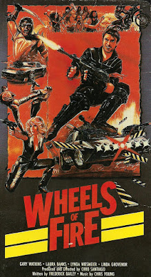 One of approximately 1.5 zillion post-apocalyptic action movies shot in a gravel pit outside Manila by Filipino director Cirio H. Santiago (STRYKER), WHEELS OF FIRE is not dull, not sophisticated, and definitely not unfun. In fact, it’s practically wall-to-wall chases, fights, car crashes, explosions, and shootouts with some occasional nudity. You can’t say Santiago and Roger Corman, who released this film through his Concorde Pictures label, didn’t give drive-in audiences what they wanted. If the score credited to Christopher Young (SPIDER-MAN 3) sounds familiar, you probably heard it in other Corman movies, including BARBARIAN QUEEN and WARRIORS OF THE LOST KINGDOM.