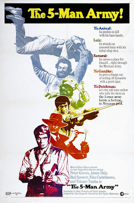 During the Mexican Revolution, The Dutchman recruits explosives expert Augustus (James Daly, then starring on MEDICAL CENTER), burly Animal (Bud Spencer), master swordsman Samurai (Tetsuro Tamba) and cocky young Luis (Nino Castelnuovo) to steal $500,000 in gold from a moving train guarded by Army soldiers and monitored at regular intervals along the track. Taylor touches all the tropes of the caper genre, the most fun being that no matter how well the plan is conceived, something is bound to go wrong, forcing the operatives to think on their feet.
