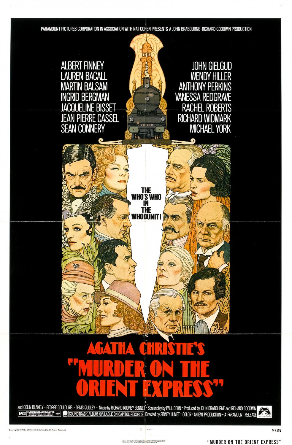 Sidney Lumet (SERPICO) directed this lavishly cast and produced mystery based on Agatha Christie’s 1934 novel MURDER ON THE ORIENT EXPRESS. It was an enormous hit in both the United States and Great Britain and earned six Academy Award nominations, winning for Ingrid Bergman’s turn as the devout Scandinavian Greta Ohlsson (her third Oscar after GASLIGHT and ANASTASIA). Albert Finney (SHOOT THE MOON) has the plum role of Christie’s famous Belgian detective Hercule Poirot, first seen in print in 1920.