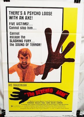 THE SEVERED ARM is a gruesome horror film that anticipates many more famous slasher pics, such as HALLOWEEN (with its use of killer POV shots), FRIDAY THE 13TH (individuals picked off one by one by a madman waving a sharp object), and WHEN A STRANGER CALLS ("the caller is inside the house"). I'm not saying those films were influenced by THE SEVERED ARM or director Thomas Alderman (COED DORM) invented these genre staples, but their presence does add interest.