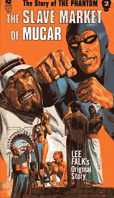 The second book, THE SLAVE MARKET OF MUCAR, was written by Basil Copper, whose career includes a lot of horror and crime fiction. It isn't an original story. Falk originally wrote "The Slave Market of Mucar" as a story arc in the daily newspaper strip that Sy Barry was then drawing. As a matter of fact, "Mucar" was Barry's debut on the PHANTOM strip. It ran 25 weeks in newspapers across the U.S. from August 21st, 1961 to February 10th, 1962. So it probably seemed fresh to readers when Avon presented it in prose form in 1972.
