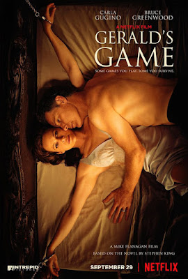 Mike Flanagan, whose thrillers include the ambitious but mediocre OCULUS and the suspenseful HUSH, directed this straight-to-Netflix adaptation of Stephen King’s novel GERALD’S GAME. Exceedingly well cast with Carla Gugino (WATCHMEN) and Bruce Greenwood (THIRTEEN DAYS) atop the bill, Flanagan’s film manages to maintain suspense most of the way, despite the inherent “unfilmability” of King’s story.