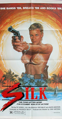 Cec Verrell is the star of SILK and one of the few Roger Corman heroines to keep her top on (but how about that rockin' poster?). Corman was the executive producer of this cheapo action meller filmed by director Cirio H. Santiago, who made a lot of them. Laughably, the film is set in Hawaii, but aside from a handful of second unit shots, including Verrell strolling across the lawn of the Iolani Palace (better known to classic television fans as Five-O headquarters), Santiago shot SILK in the Philippines, fooling nobody.