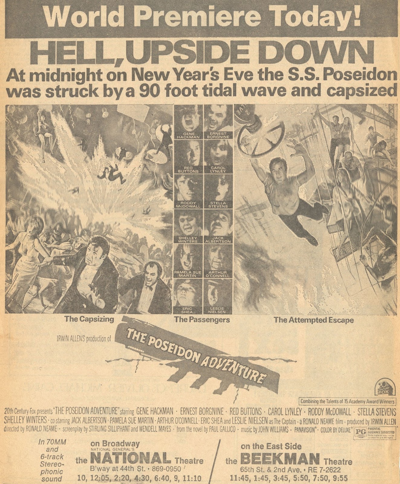 THE POSEIDON ADVENTURE influenced a decade or more of “disaster movies” — big-budget thrillers with all-star casts trying to survive a major calamity — though one could argue AIRPORT is the genre’s true father. In any case, Irwin Allen, who was then famous for science fiction television, such as LOST IN SPACE and VOYAGE TO THE BOTTOM OF THE SEA, grabbed the football and ran with it, producing THE TOWERING INFERNO, THE SWARM, and WHEN TIME RAN OUT…, while other producers rolled out ROLLERCOASTER, TWO-MINUTE WARNING, THE HINDENBURG, EARTHQUAKE, AVALANCHE, and three AIRPORT sequels, among other disaster flicks, in short order.