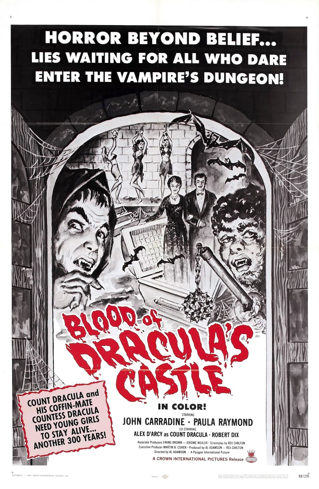 Gene Shane (HELL’S BLOODY DEVILS) stars as a wiseass fashion photographer who inherits the castle from a late uncle. He takes his model girlfriend Jennifer Bishop (THE MALTESE BIPPY) to look it over, intending to move into it when they get married. Trouble is, the present tenants, middle-aged Alex D’Arcy (HOW TO MARRY A MILLIONAIRE) and Paula Raymond (THE BEAST FROM 20,000 FATHOMS), don’t want to leave. Double trouble: they’re vampires who use butler John Carradine (THE ICE PIRATES), psycho Robert Dix (SATAN’S SADISTS), and mindless hulk Ray Young (BLUE SUNSHINE) to snatch young women and chain them in the cellar for use as a blood buffet. The dungeon is obviously a cheap plywood set at odds with the glamour of the real castle.